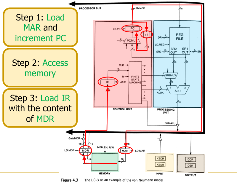 - Access Memory: The memory system, using the address in MAR, retrieves the instruction from memory and places it in the Memory Data Register (MDR).