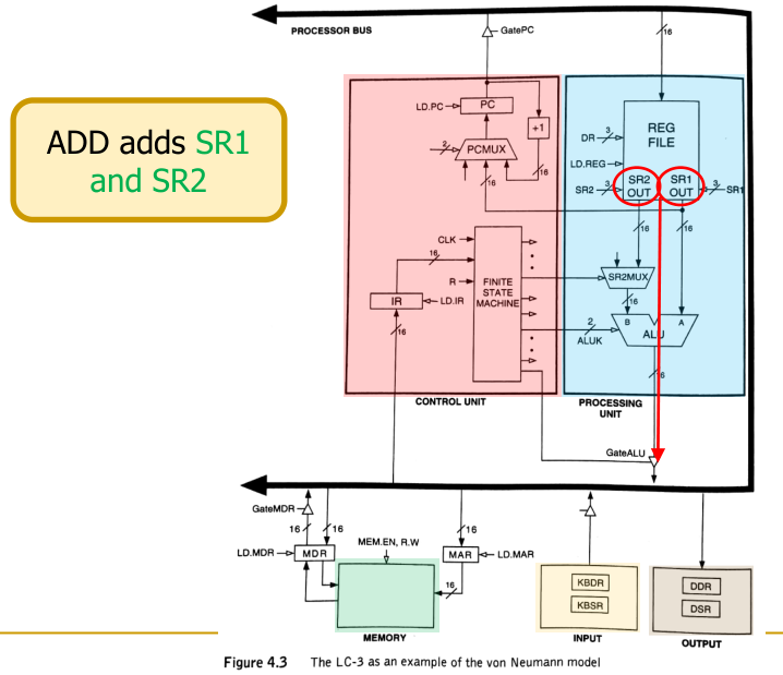 LDR, the address is computed by adding (depicted as the red ADD box in the image below) the value of a base register (BaseR) and a sign-extended offset from the instruction. - MAR Loading: The calculated address is loaded into the Memory Address Register (MAR).