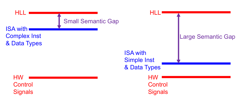 - Large Semantic Gap (Simple ISA): ISAs with simple instructions and data types are further from high-level languages, requiring more complex compilers to bridge the gap but potentially simplifying hardware.