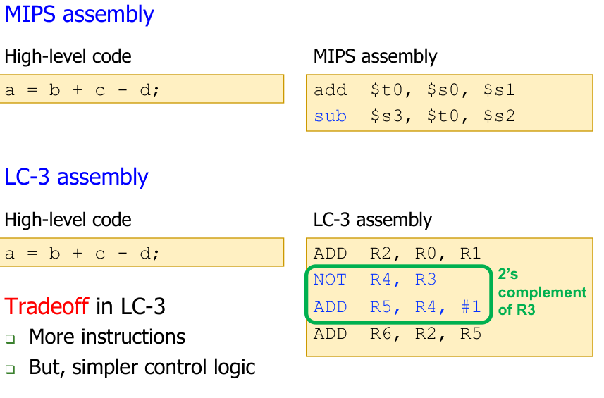 subinstruction for direct subtraction. - LC-3: Requires a sequence of instructions (NOT and ADD) to perform subtraction using two’s complement arithmetic.