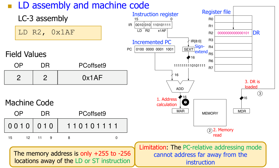 Effective Address = PC + sign-extend(PCoffset9)(where PC is the incremented PC). - Range Limitation: PC-Relative addressing is limited to a relatively short range around the instruction in memory (+255 to -256 locations).