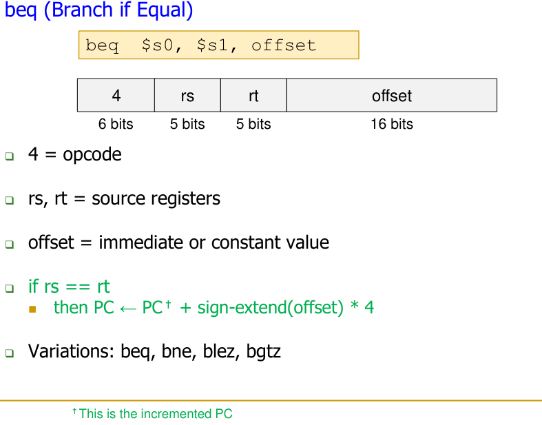 beqdirectly compares the values of two registers (rs and rt). - Branch Action: If the registers are equal (