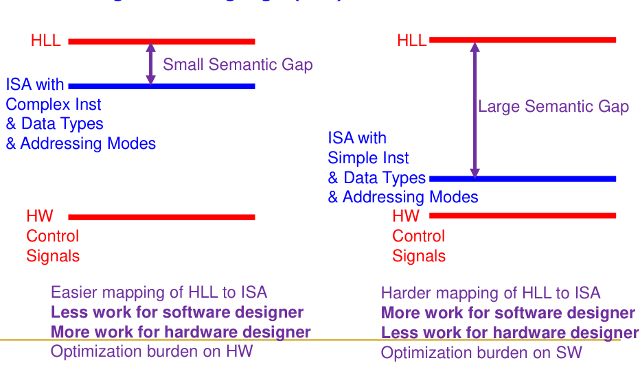 - Large Semantic Gap (Simple ISA): ISA is further from high-level languages, requiring more complex software (compilers) to bridge the gap, but potentially easier to implement efficiently in hardware.