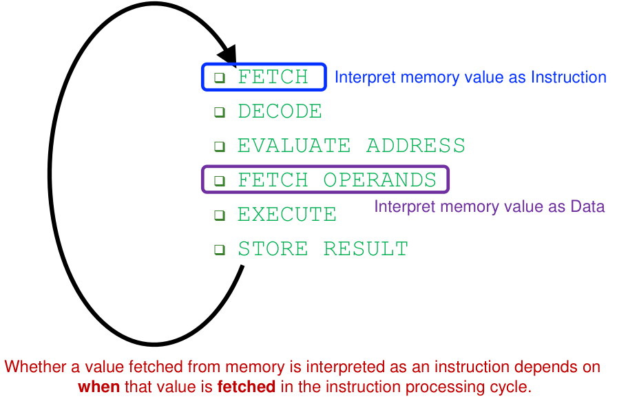 A key question to ponder is: When is a value in memory interpreted as an instruction versus data?
