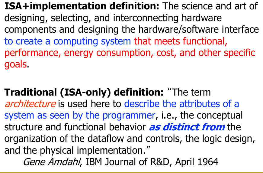 Let’s revisit the definition of Computer Architecture, considering both ISA and implementation perspectives.
