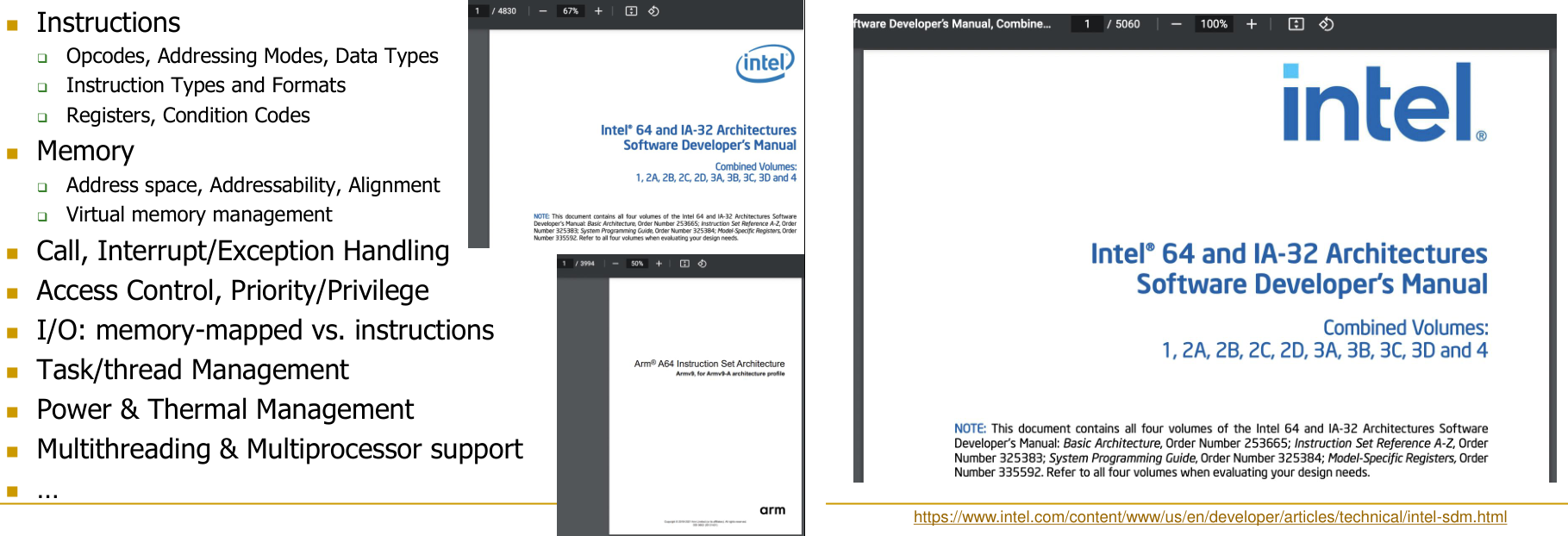 Finally, ISA manuals are presented as valuable resources for those seeking a deep understanding of specific ISAs like Intel’s x86-64 and ARM’s A64. These manuals provide detailed specifications of instructions, data types, addressing modes, and other architectural features.