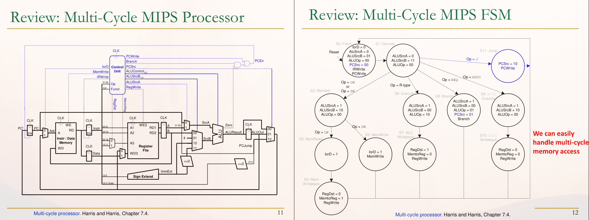 We then improved this with the multi-cycle microarchitecture by breaking instruction execution into multiple cycles, reducing the clock cycle time.