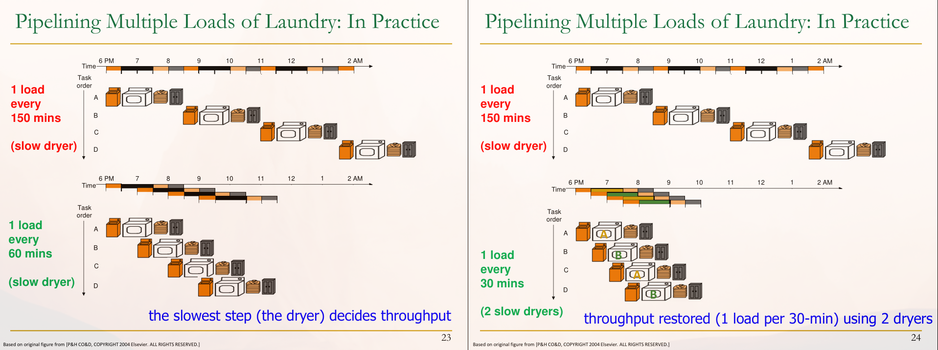 In Practice (Slowest Stage Bottleneck): If the dryer takes 1 hour instead of 30 minutes, it becomes the bottleneck. In the sequential case, each load now takes 2.5 hours. In the pipelined case, you can’t start drying the next load until the previous one finishes. The dryer now dictates the pace – you finish one load every hour, not every 30 minutes. The slowest stage determines the pipeline’s throughput.