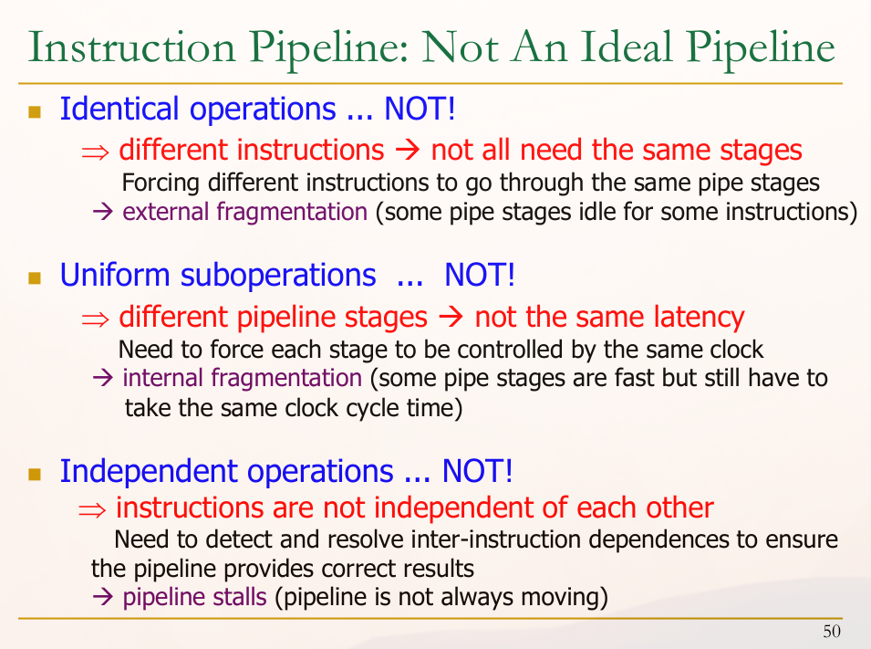 As we hinted earlier, the instruction pipeline is not perfectly ideal like the laundry or automobile assembly line. Several properties are violated, leading to performance challenges: