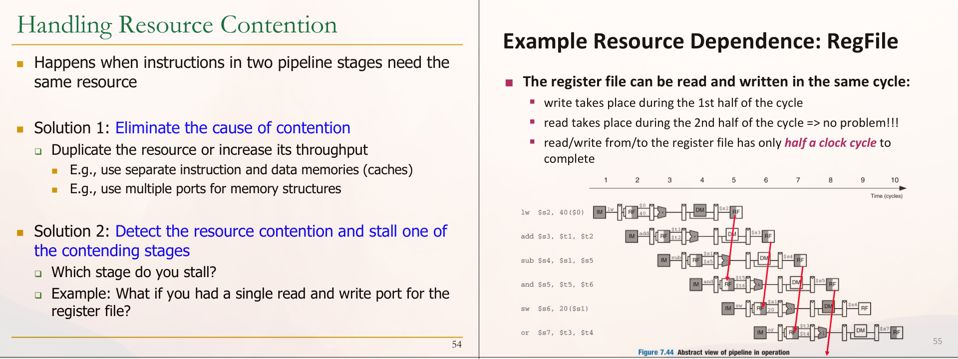 Resource contention (or structural hazards) occurs when the hardware doesn’t have enough copies of a resource to support concurrent instructions needing it in the same cycle.