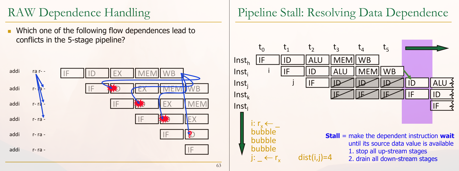 RAW Dependence Problem: A later instruction needs a value produced by an earlier instruction, but the value isn’t available when the later instruction reaches the stage where it needs that value (e.g., ID/EX stage for register operands).