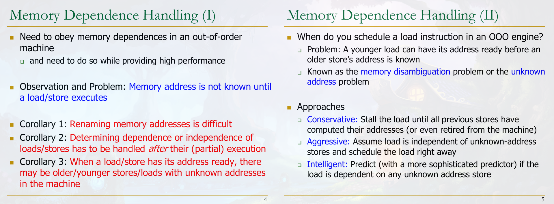 - Checking for dependencies or independence between memory operations must often be done after the instructions have partially executed (i.e., after address generation).