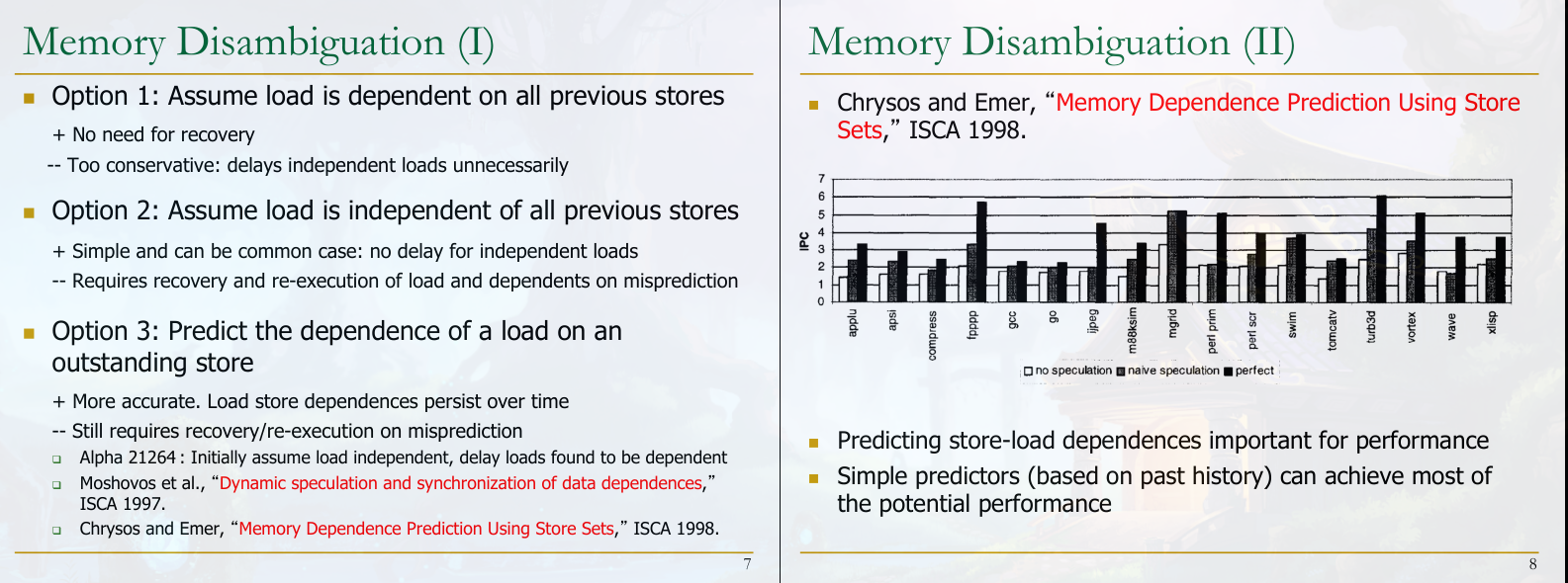 - Intelligent Approach: Predict whether the load is likely to be dependent on an older store with an unknown address using sophisticated prediction mechanisms. Schedule the load based on this prediction. This aims to achieve better accuracy than simply assuming independence but still requires recovery on mispredictions. Memory dependence predictors can learn from past load/store access patterns.