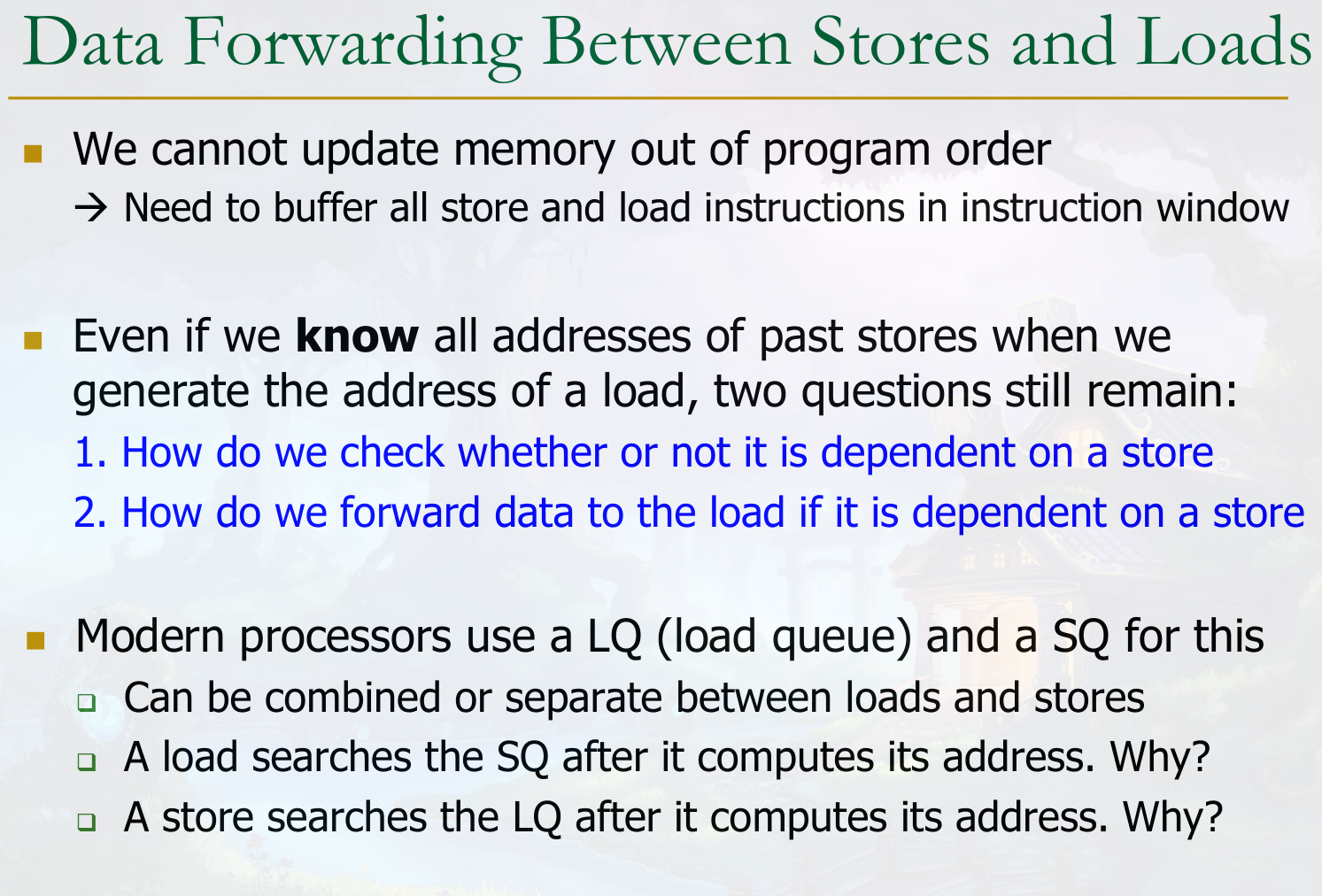 - When a load or store generates its address, there might be older or younger memory operations in the pipeline with addresses that are still unknown, making definitive dependency checks impossible at that moment.