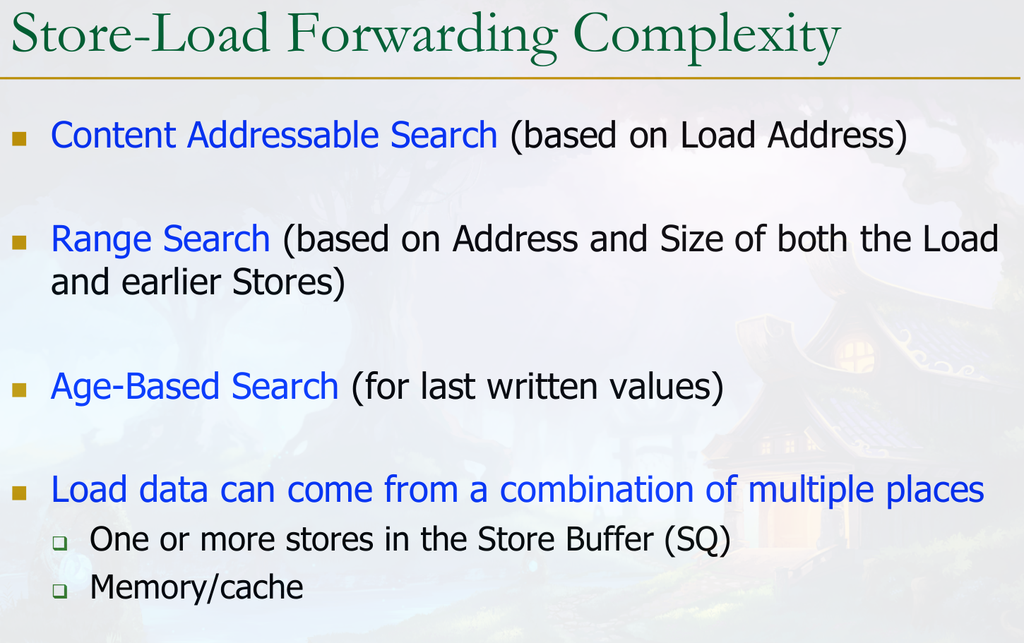 The hardware for this search is complex, essentially implementing a Content Addressable Memory search based on address, but also needing to consider the size and age of the memory operations.