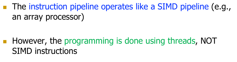 The GPU instruction pipeline operates like a SIMD pipeline, processing elements of a warp concurrently. However, unlike traditional SIMD processors where instructions explicitly specify operations on vector registers, GPU threads execute scalar instructions. The hardware dynamically groups these scalar threads that are at the same Program Counter (PC) into warps and issues them to the SIMD execution units.