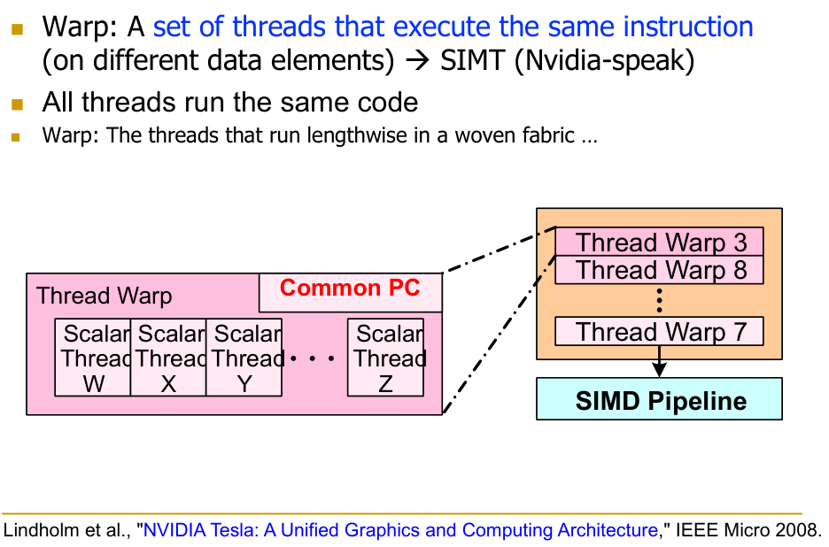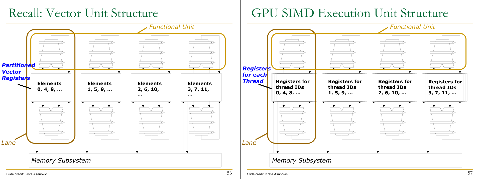 The execution of a warp on an SM utilizes the SIMD functional units in parallel. The structure of a GPU SIMD execution unit resembles that of a vector processor’s functional unit, with lanes processing different elements concurrently. However, the registers feeding these lanes are thread-private (or per-thread ID) registers rather than a single large vector register.