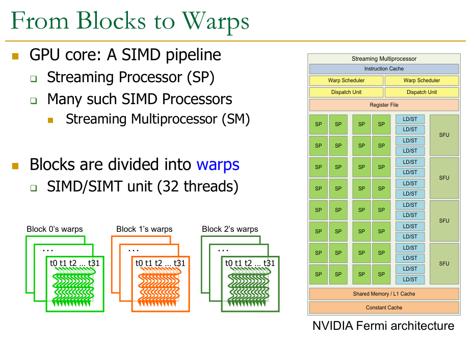 A GPU core typically contains a SIMD pipeline, often referred to as a Streaming Processor (SP) in NVIDIA terminology. Many such SPs are grouped together into a Streaming Multiprocessor (SM).