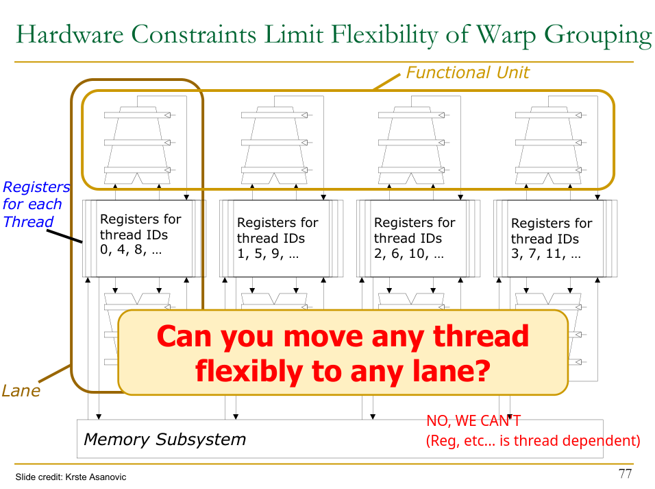 However, the flexibility of dynamically grouping threads is constrained by hardware, particularly the physical mapping of thread registers to SIMD lanes. A thread is tied to a specific lane, limiting which threads can be part of the same warp executing a particular instruction.