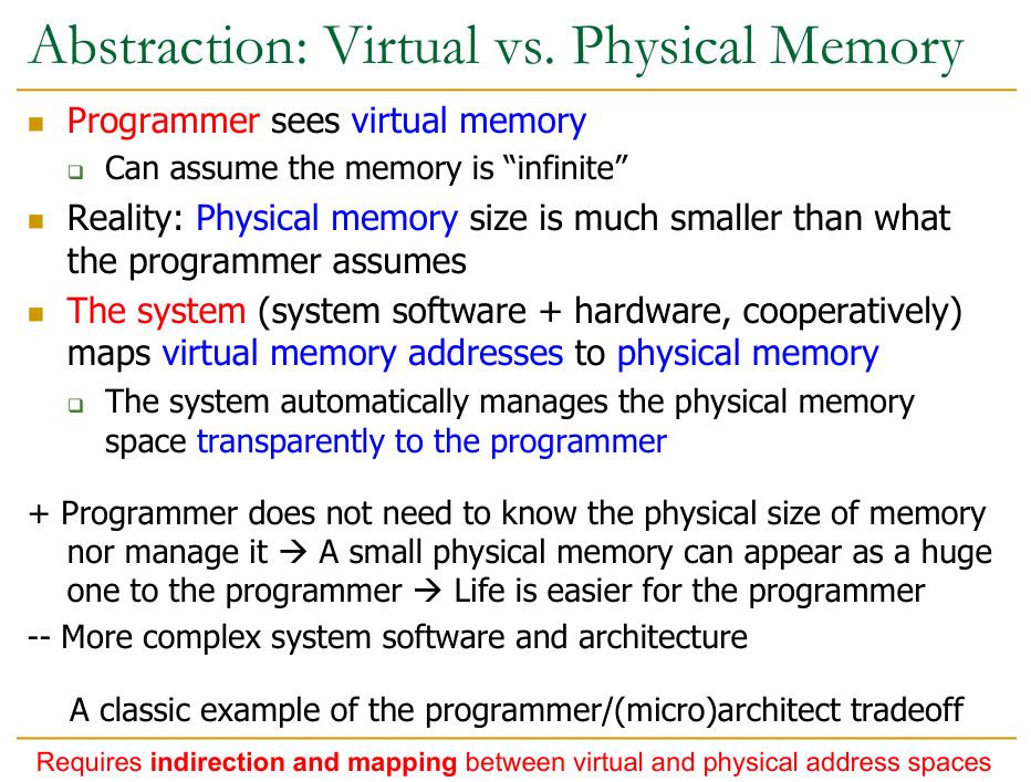The programmer operates within a potentially vast virtual address space. The system (hardware, like the Memory Management Unit or MMU, and system software, like the OS) maps segments of this virtual space onto a smaller, finite physical memory (DRAM) and potentially slower backing storage (disk). This mapping is transparent to the programmer, simplifying software development by hiding physical memory limitations and allowing address space isolation between processes. While beneficial for programming, it adds hardware complexity (MMU, page tables) and potential performance overheads (page faults, Translation Lookaside Buffer - TLB misses) that are typically managed by the operating system.