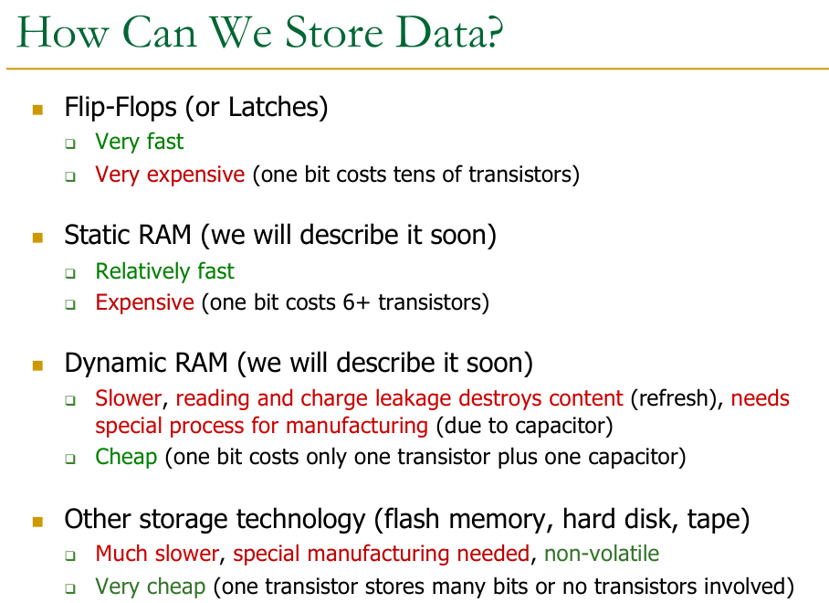 - SRAM (Static Random Access Memory): Fast, non-volatile (while powered), typically uses 6 transistors per bit, configured as cross-coupled inverters with access transistors. Expensive, lower density. Used for fast caches (L1, L2).