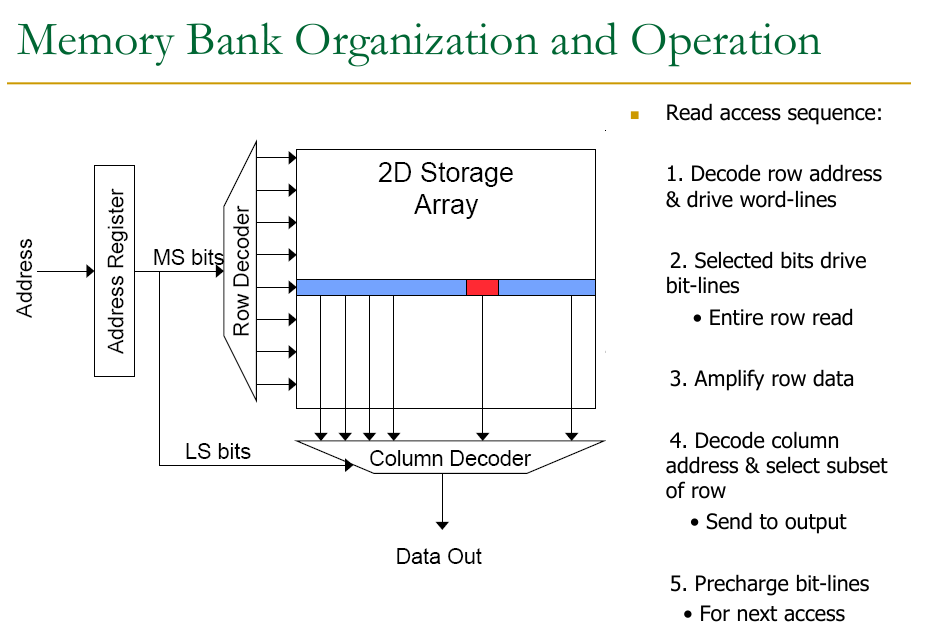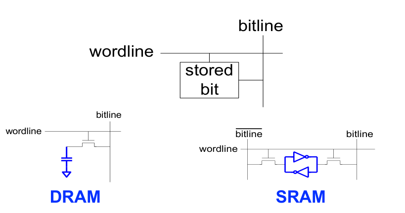 - DRAM (Dynamic Random Access Memory): Slower, uses one transistor and one capacitor per bit. Stores data as charge level. Cheaper, higher density. Requires periodic refresh due to capacitor leakage (reading and restoring charge). Read is destructive (discharges bitline), requiring the activated row’s data to be written back to the array after sensing. Used for main memory (larger capacity).