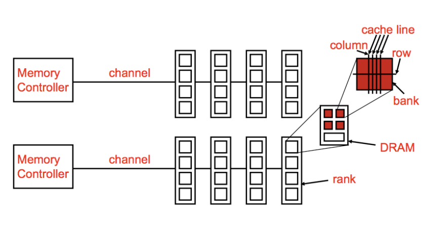 - Chips: A DRAM chip contains multiple banks (typically 8 or 16). Banks within a chip share external pins for command, address, and data buses to reduce chip cost and pin count.