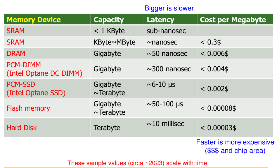 - Faster is More Expensive: Technologies like SRAM are much faster than DRAM but are also significantly more costly per bit and have lower density (requiring more chip area). DRAM, in turn, is faster and more expensive than SSDs or traditional hard disks.