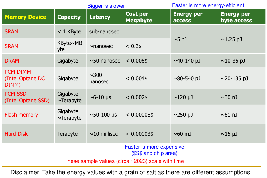 The ideal memory system would be infinitely large, infinitely fast, have zero cost, infinite bandwidth, and consume zero energy. However, real-world memory technologies present fundamental trade-offs: