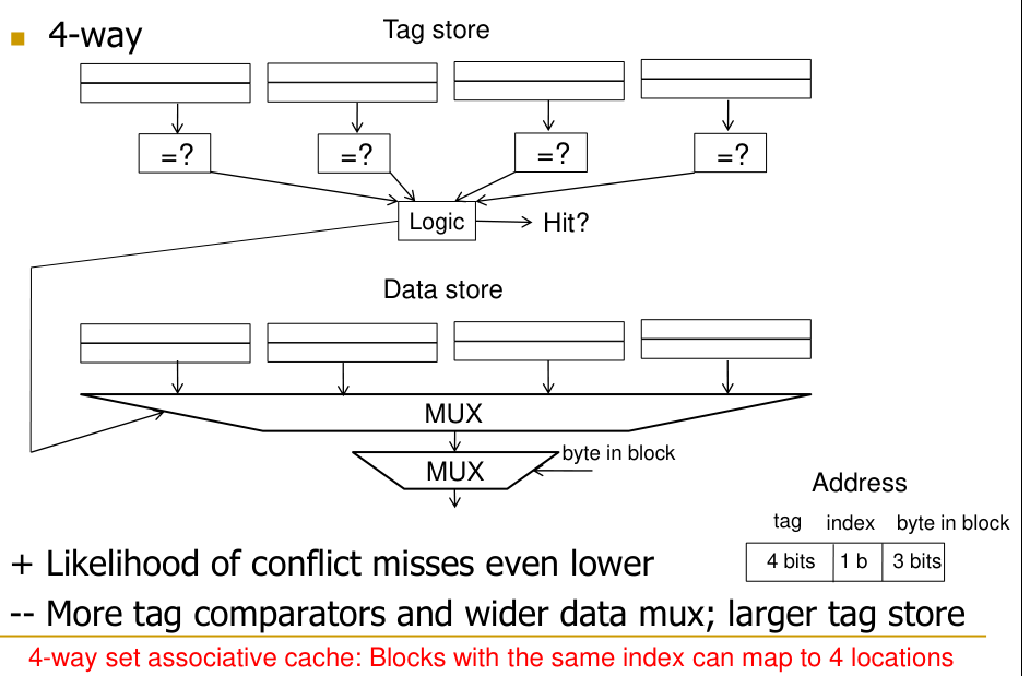 - Cost: More complex hardware (multiple comparators, MUX to select data from the hit way), potentially slower access, larger tag store (tags are wider because the index is smaller).