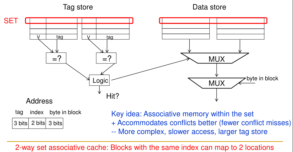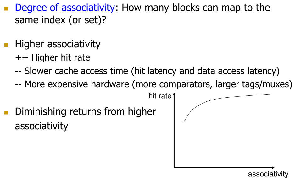Higher associativity reduces conflict misses. It’s feasible to have non-power-of-2 associativity (e.g., 3-way), as it primarily affects the number of comparators and MUXing within a set, not address decoding for set selection.