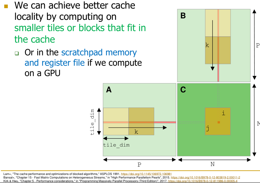 - Blocking (Tiling): Divide large data structures (like matrices in matrix multiplication) into smaller blocks or tiles that fit into the cache. Computations are then performed tile-by-tile. This enhances temporal locality for the tiled data.
