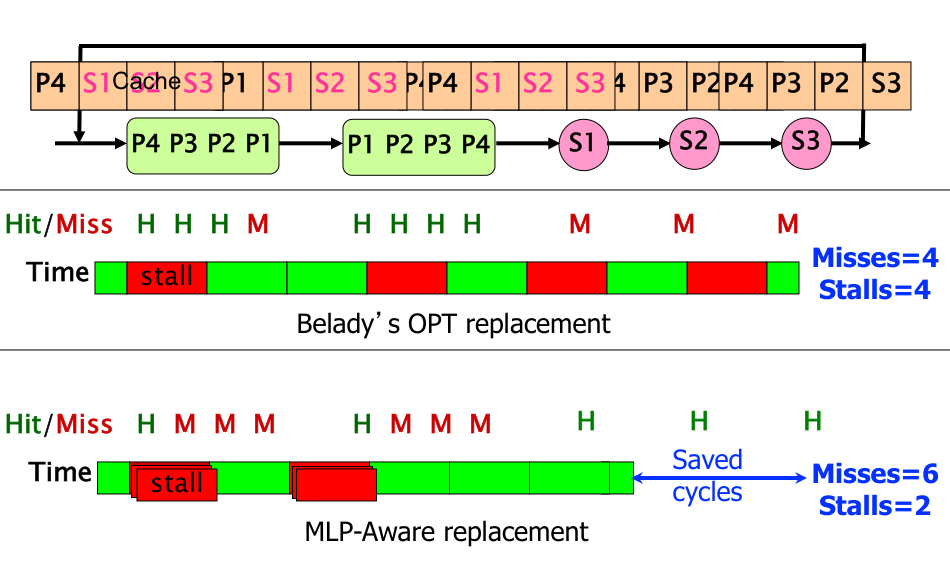 - MLP-Aware Policy: Aims to keep the high-cost S-blocks in the cache, even if it means incurring more misses on the lower-cost P-blocks. This might result in more total misses (e.g., 6 misses) but a lower overall stall time (e.g., 2 units of stall) because the P-block misses are parallelized.