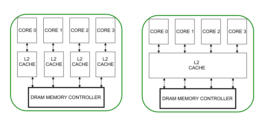 - Shared caches (e.g., a common L3) allow dynamic space allocation, avoid data replication within that level, and simplify coherence for blocks within it, but can suffer from inter-core interference and slower access times.