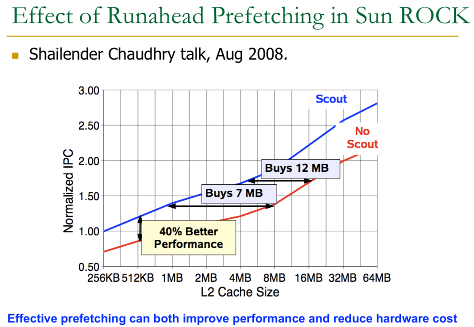 Effective prefetching can improve performance and even reduce the need for larger cache hardware to achieve a target performance level, as shown by studies like those on Sun ROCK’s “Scout” prefetching (a form of runahead execution).