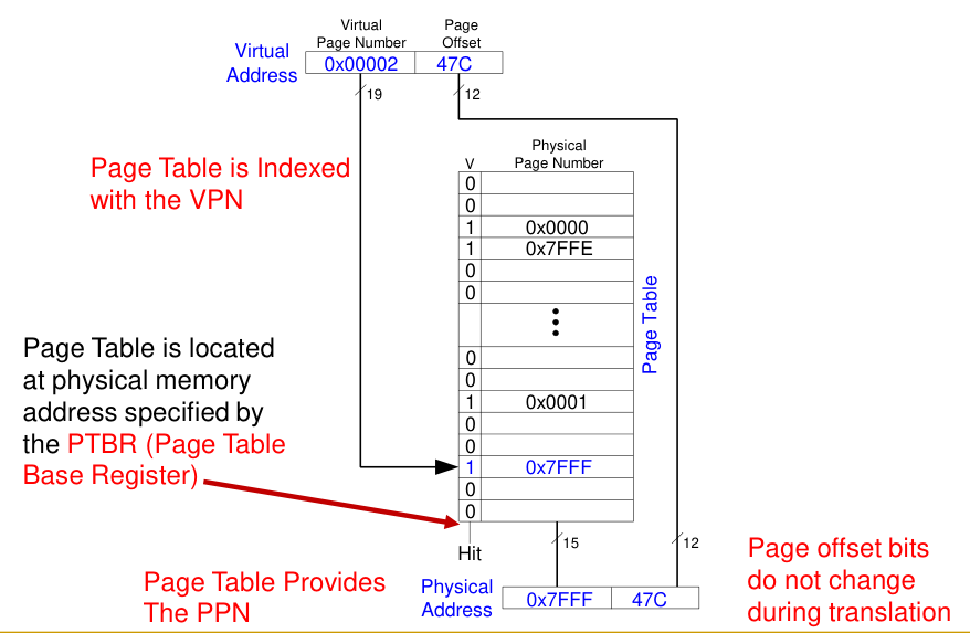 - The hardware (a dedicated “page walker” state machine in the MMU) automatically performs the page table walk to find the PTE in memory.