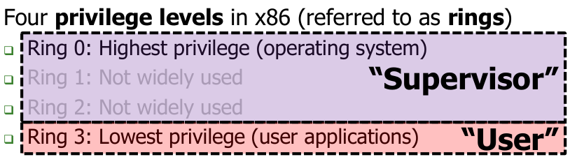 CPUs often support multiple privilege levels. In x86, Ring 0 (kernel/supervisor) has the highest privilege, while Ring 3 (user applications) has the lowest. Access to certain pages or instructions is restricted based on the current privilege level. PTEs and Page Directory Entries (PDEs) in x86 contain User/Supervisor (U/S) bits and Read/Write (R/W) bits to enforce this.