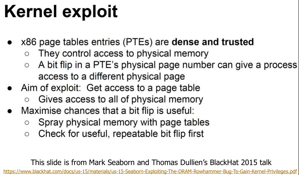 - Allow a process to gain unauthorized access to arbitrary physical memory by corrupting the PPN to point to another process’s data or even the OS’s page tables. Google Project Zero demonstrated such an attack, where RowHammer-induced bit flips in PTEs were used to gain kernel-level privileges.