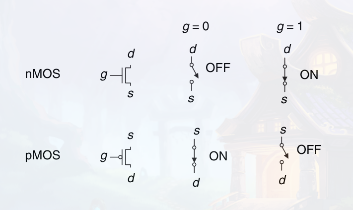 A pMOS also acts as a normally-OFF switch, but with inverted gate logic: