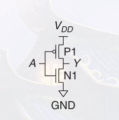 Structure: A single pMOS transistor (P1) forms the PUN, and a single nMOS transistor (N1) forms the PDN. Both gates are connected to the input A, and both drains are connected to the output Y.