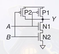 PDN: Two nMOS transistors (N_A, N_B) are connected in series. Both input A AND input B must be ‘1’ for both nMOS to turn ON, pulling the output Y to GND.