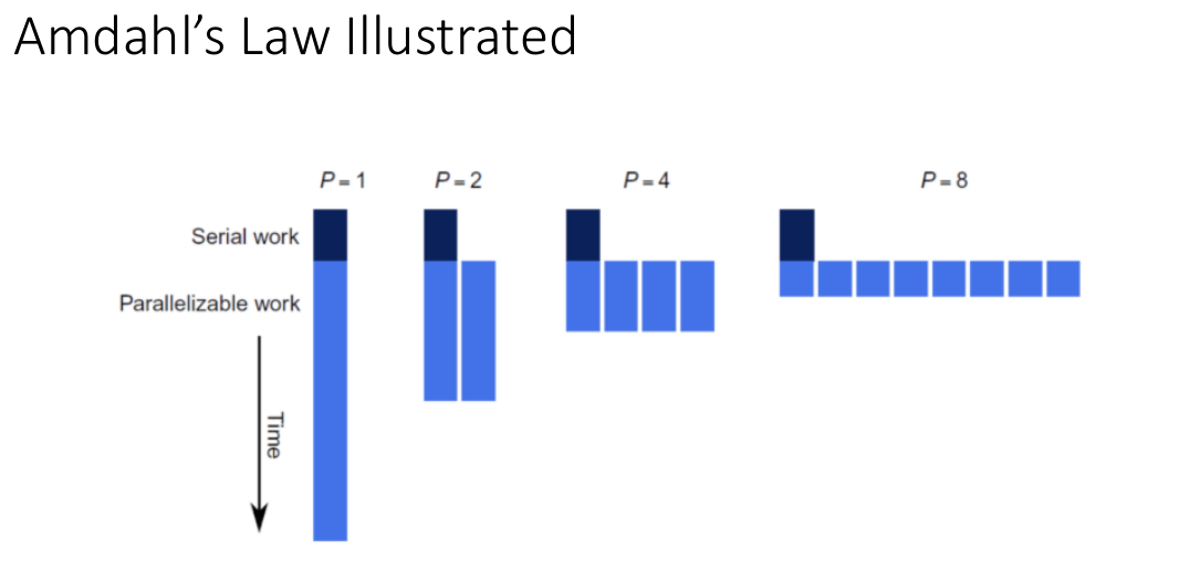 - Amdahl’s Law: Assumes a fixed problem size. The total amount of work () is constant.