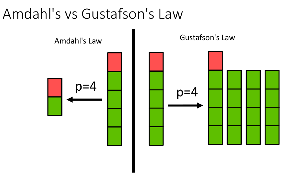 - Gustafson’s Law: Assumes a fixed execution time. We’re willing to solve larger problems if we have more processors, keeping the execution time constant.