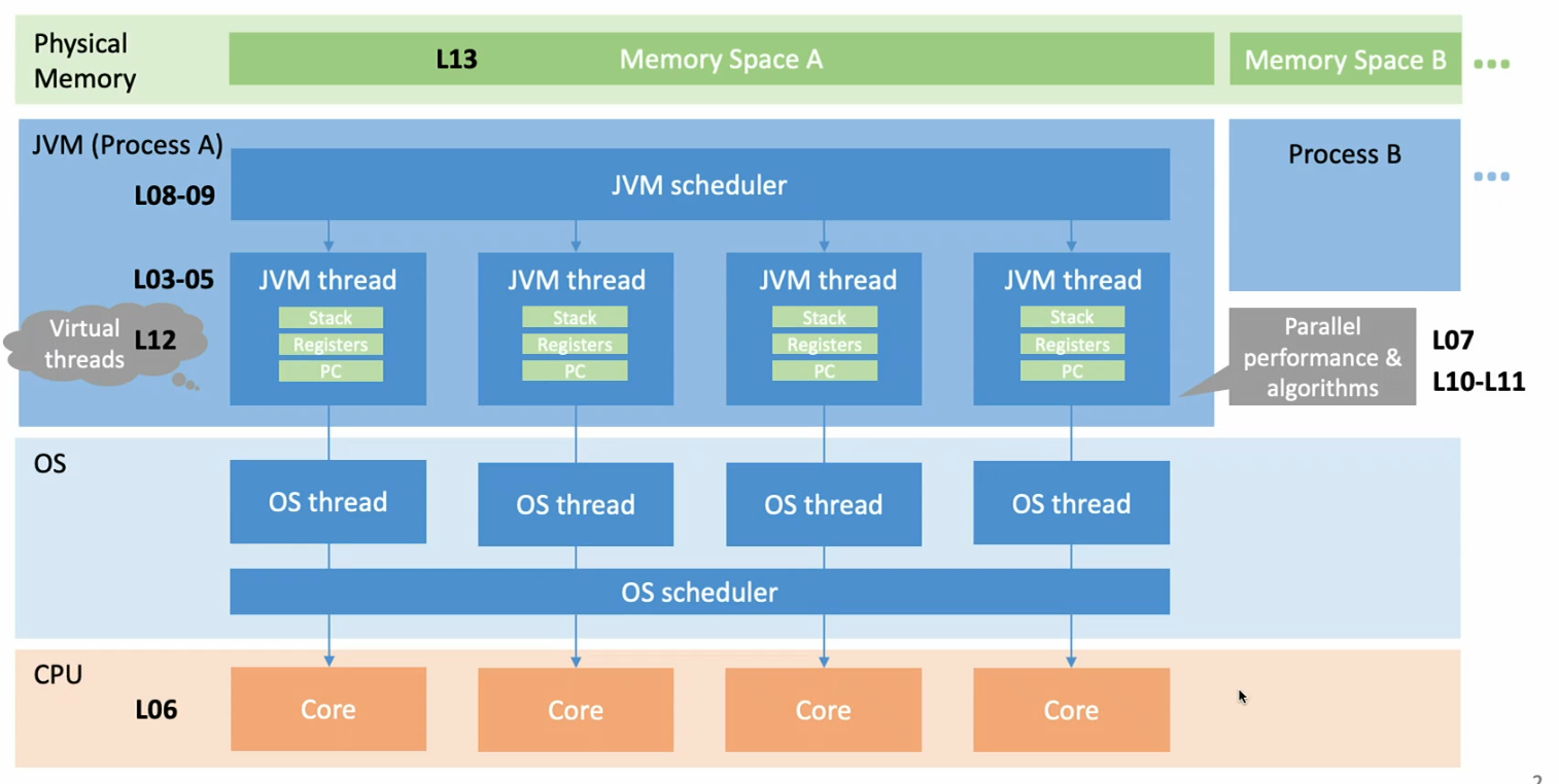 Just to keep us grounded, let’s remember the overall system architecture. We have the physical memory, processes (like the JVM), threads within those processes, the operating system managing everything, and the CPU cores doing the actual work. Our goal is to write programs that utilize these resources efficiently.