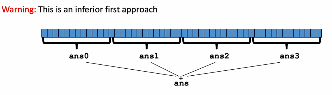 Let’s try a first, intuitive approach to parallelizing this. We could divide the array into four equal parts and have four threads, each summing one part. Then, we combine the four partial sums to get the final result.