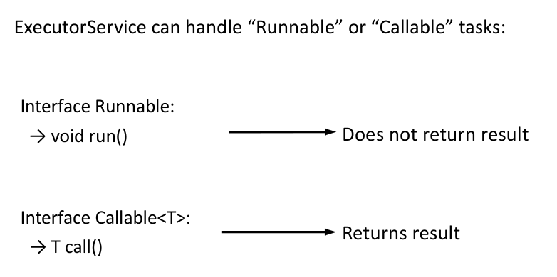 Runnable: Represents a task that doesn’t return a value. Itsrun()method has avoidreturn type.Callable<T>: Represents a task that does return a value (of typeT). Itscall()method returns a value of typeT.