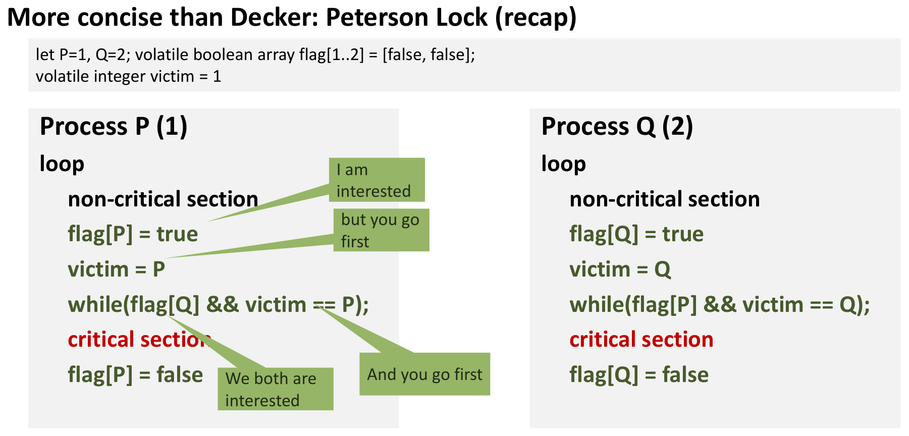 Peterson’s lock provided an elegant mutual exclusion solution for two processes using flag variables (intent) and a victim variable (tie-breaker). It guarantees mutual exclusion and freedom from starvation but is limited to two threads.