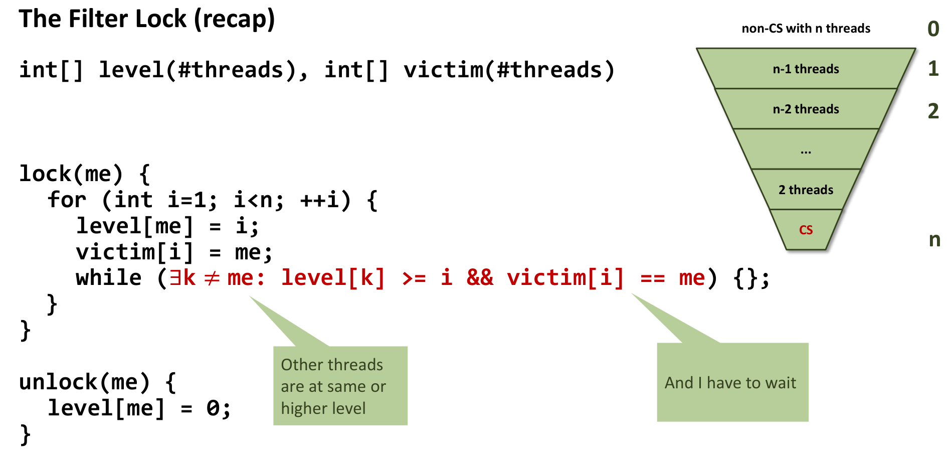 Let’s briefly recall the lock implementations from last time that relied solely on atomic/regular memory reads and writes.