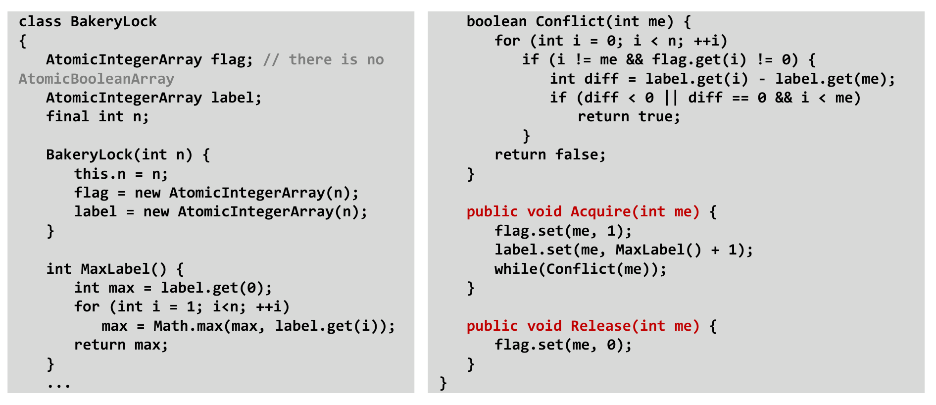 Its Java implementation requires AtomicIntegerArray for correctness due to the JMM. While correct and fair, it also suffers from inefficiency as threads must read all other threads’ flags and labels in the waiting loop.