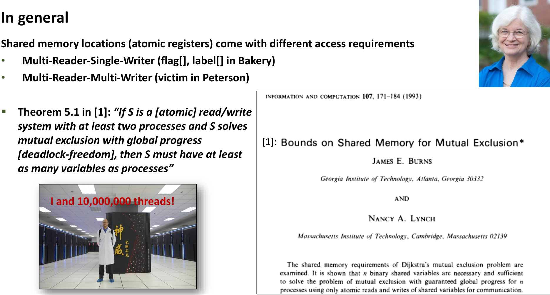- Space Complexity: They often require shared variables proportional to the number of threads (N). Theorem 5.1 by Burns shows that any deadlock-free mutual exclusion algorithm using only read/write atomic registers needs at least N variables. This doesn’t scale well if N is potentially huge (e.g., millions of threads/tasks).